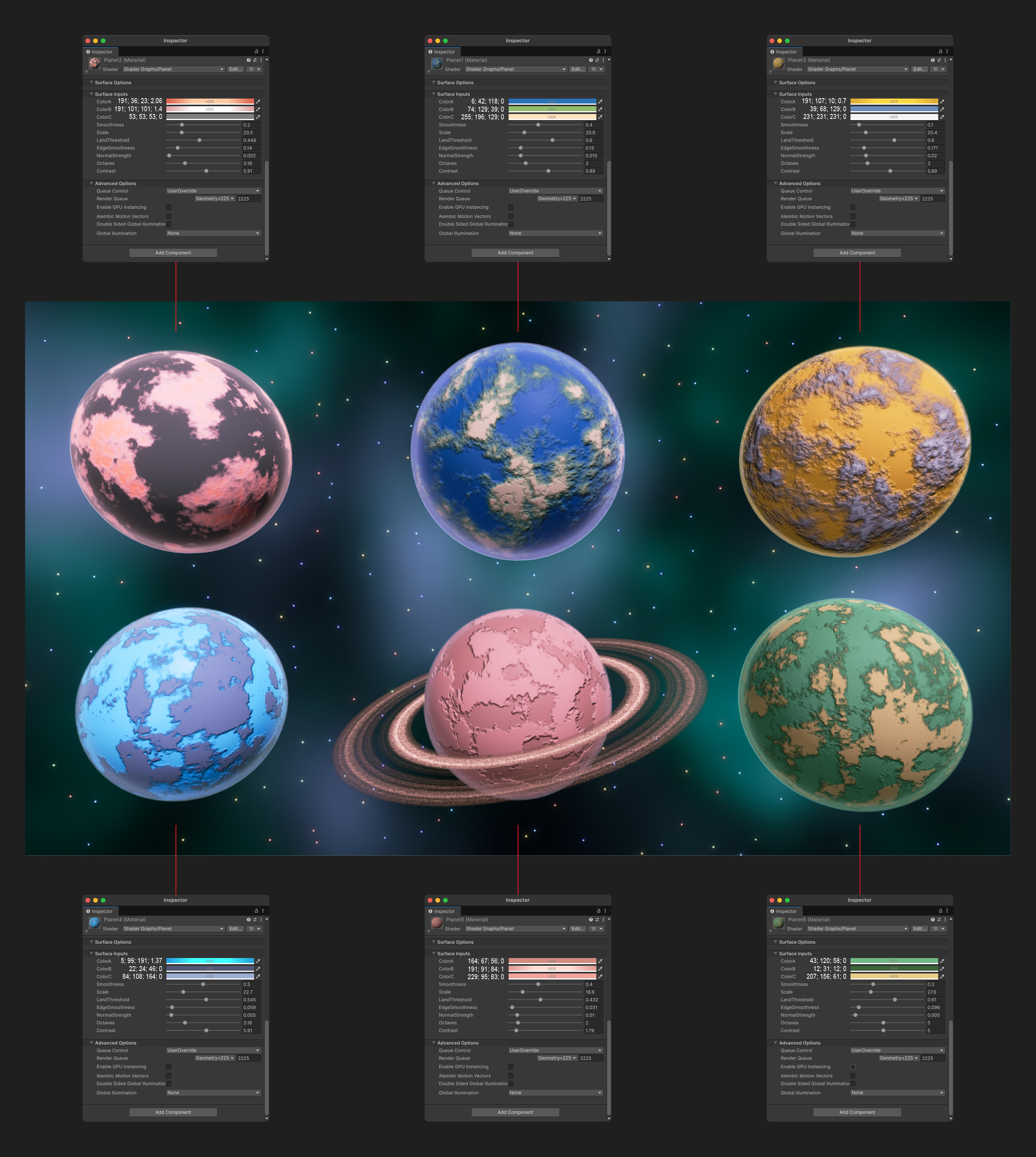 Example settings for planet materials (color coding - R; G; B; Intensity)